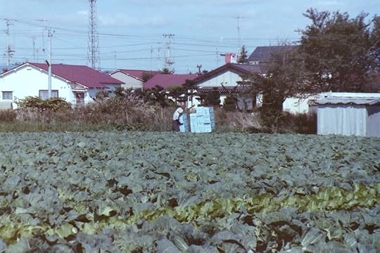 This field of cabbage is both green and real. It wasn't a whole lot bigger than what you can see here, but it was still a commercial operation. You can see one of the workers in the back stacking up the produce boxes. This little field was nested into the city of Misawa, where I lived.