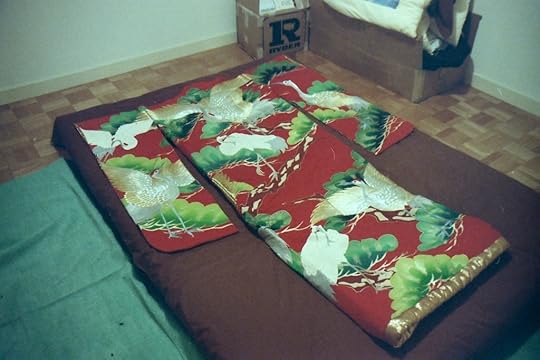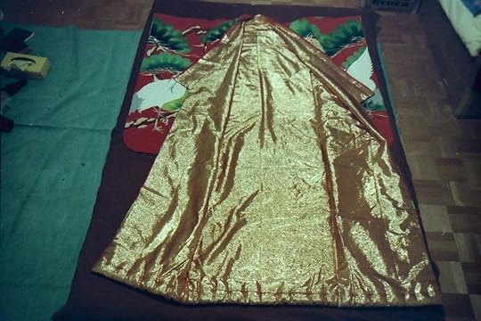 See, not everything is about food. Check out this Japanese wedding kimono, or uchikake. I picked it up for a song (and about $120 American) at a used kimono sale. The Japanese usually don't care much for used stuff, but since these things (at the time) could go for thousands of dollars, a rental market existed for those who couldn't afford to buy them. After several weddings, they cycled the gowns out to resellers who primarily targeted Americans. These things sported lots of hand-done embroidery.