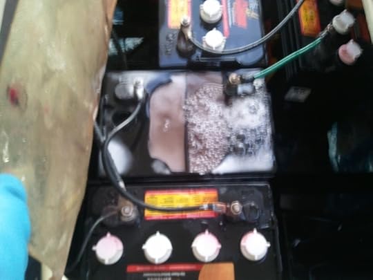 Why I didn't recall my father's advice until after the explosion, I'll never know. When I was young, battery charging was just one of the many chores that had to be done, and Dad admonished me to always loosen the caps on a battery's cells when it was undergoing more than a trickle charge. He knew well that a charging battery gives off hydrogen, and an exploding battery is simply not much fun. I spent five hours today trying to neutralize the battery's sulphuric acid with baking soda, even having to make a trip to the store to get more of the sodium bicarbonate. I used nearly ten pounds of the stuff, and the golf car is still sitting out on the driveway with the battery bubbling. The picture is slightly out of focus, but you can see the bubbles in the acid as the soda does its thing. I sure could have used some NaOH (Acid + Base => Salt + Water).