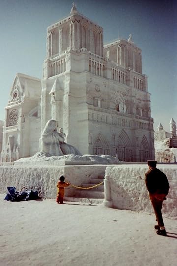 No, this isn't Paris in a blizzard. We've finally gotten close enough to garner a good gander at the snow cathedral. I think they said it was somewhere from 25% to 35% scale. That's a LOT of snow! I don't know how they get it piled up high enough, but they do use big trucks to move the snow.