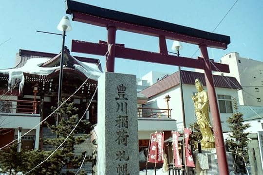 Unless I am mistaken, this temple in Sapporo demonstrates the blending of Shintoism with Buddhism. The torii gate is the Shinto gate into the detached world where the Shinto temple is supposed to exist, while the golden figure just inside the gate seems clearly Buddhist to me. Maybe someone can set me straight if I am in error about this — I'm not exactly an expert on Buddhism. But Americans who have seen the familiar sight of a Gideon's Bible in a hotel room may be interested to know that it is not unusual to find a book about the Buddha in Japanese hotel rooms, and you may well find it written in English, as well!