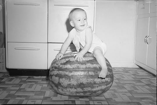 Here I am, showing off my prize watermelon. It was the year James Dean died and Elvis signed with RCA. Rock Around the Clock. Bobby socks and poodle skirts. Disneyland opened, and Jonas Salk developed the polio vaccine. And I, in my first year of inhaling earth's nitrogen-oxygen atmosphere, grew the world's largest watermelon … yeah … that's the ticket … the world's LARGEST WATERMELON. Yeah!