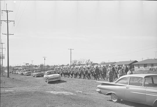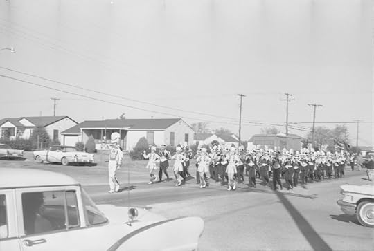 At least one of my sisters was in this particular high school band. The avenue on which they are marching is now a four-lane, and cars can no longer park along the shoulders. We know it is at least 1959, since in the lower right there is a 1959 Chevrolet Biscayne coupe, and, judging from the shadows, we know it is near noontime. This photo was taken with 120 black and white film.