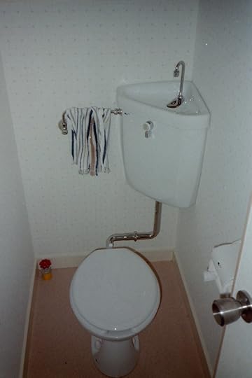 No wasted space here. The tank goes in the corner, and the feed pipe doubles as a towel rack. When you push the flush lever (either direction), the water comes out the faucet at the top so you can wash your hands, and the water is caught in the basin on the top and continues on into the tank, ready to provide the fluid for the next flush. No place for soap, though. Also note the brake on the toilet paper dispenser. Handy thing, that — it rests on the top of the roll and prevents it from spinning off paper onto the floor if you pull too hard.