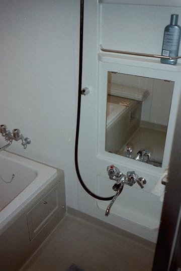 Bath time in Japan is right before dinner (or supper, depending on what part of the US you come from). The black hose rises to a shower head, but if you want to do it the Japanese way, you'll need to get yourself a short stool and a pan, one that looks like it was meant for watering your dog, and you sit in front of the faucet and wash yourself. The tub is used for soaking, only, thank you very much. In the mirror you can see the insulating cover for the tub, in case you want to set it up in advance, or in case the whole family needs to use the same water: Grandparents first, then the parents, then the older children, then the young children, males before females. That tub is short, but it is deep. I got caught in there once during a 5.1 earthquake, and I feared the roof would fall in and I would be drowned in the tub before it could drain.