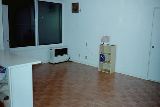 Shortly I will have a nice carpet, a low-to-the floor Japanese table, a big TV, a component stereo system and large speakers, with bookshelf Bose speakers in the rear for surround sound. In the corner you can see the kerosene heater I mentioned previously. You can also see the connection for the fuel line. Above, on the wall, there is an exhaust fan in case the kerosene fumes get overpowering. It doesn't do much for the carbon monoxide, though, since that is heavier than air, but the window slides open and you can let in cold, fresh air (except that the heater vent is right beneath the window!) to go with the warm, toxic air — basically the same principle as heating with a hibachi (in other words, sleep with a heavy comforter and wear a hat in the wintertime). On the shelf beneath the phone is my Katakana (one of two Japanese phonetic alphabets) study book and some Japanese dictionaries. Pay no attention to that bag of potato chips under the bar.