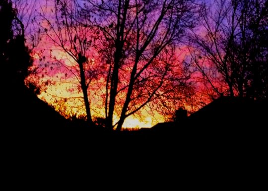Red skies in the morning, sailors take warning. This is how the sunrise appeared out my back door this chill morning, November 24, 2013. The sleet and snow is coming, and a hot cup of coffee and hot bath call to me. Curl up with your best dog, if you are so blest to have one, and try to stay warm. Open a window a bit if you are heating with coals or kerosene, lest the fumes overtake you. I hear ghosts wreaking havoc in my attic, so I must attend.