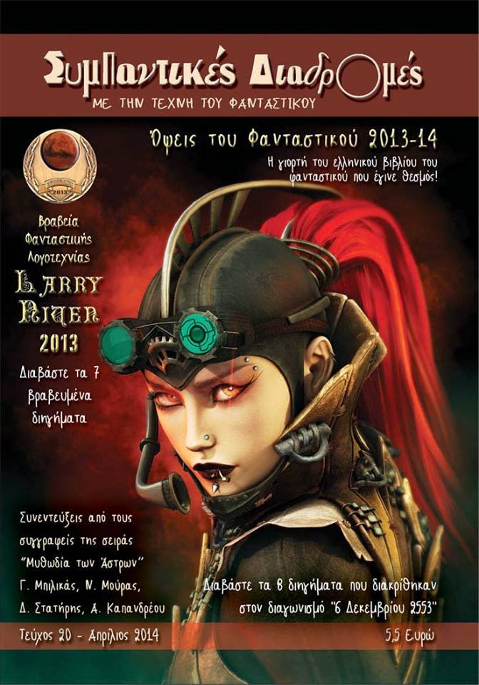 - Ευχαριστώ το Περιοδικό για τη φιλοξενία και για τη δυνατότητα που μου δίνει να επικοινωνήσω με τους αναγνώστες του. Με την έκδοση του νέου μου βιβλίου συντάσσομαι κι εγώ μαζί με τον εκδοτικό οίκο Συμπαντικές Διαδρομές στον αγώνα που διεξάγει για τη διάδοση της λογοτεχνίας του φανταστικού στην Ελλάδα.