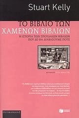 Το βιβλίο των χαμένων βιβλίων: Η ιστορία των σπουδαίων βιβλίων που δε θα διαβάσουμε ποτέ / Stuart Kelly ; μετάφρ. Ρίτα Κολαΐτη Αθήνα : Εκδόσεις Πατάκη, 2009.[Τίτλος πρωτοτύπου: The books of lost books] Με ευανάγνωστο τρόπο ο συγγραφέας μας δίνει λεπτομέρειες για την ιστορία μερικών από τα σπουδαιότερα βιβλία όλων των εποχών, τα οποία δυστυχώς, δεν θα έχουμε την τύχη να διαβάσουμε ποτέ.