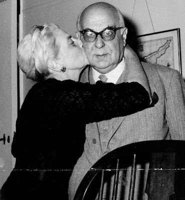 Στηνπιο πάνω φωτογραφία τον αγκαλιάζει και τον φιλά η γυναίκα του Μαρώ Ζάννου,μόλις έγινε γνωστό ότι του απονεμήθηκε το Νόμπελ Λογοτεχνίας το 1963 και στοντοίχο πίσω του διακρίνεται ο χάρτης της Κύπρου.