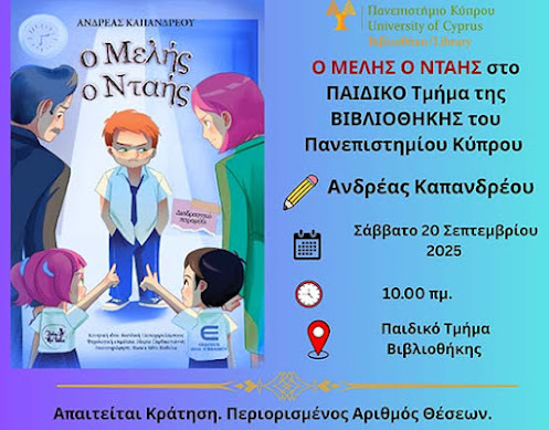 Το Παιδικό Τμήμα Βρεφικής, Προσχολικής και Πρώτης Σχολικής Ηλικίας με χαρά σας προσκαλεί σε ένα μοναδικό Παραμυθοσάββατο στη Βιβλιοθήκη του Πανεπιστημίου Κύπρου, παρέα με τον Μελή τον Νταή και τον συγγραφέα Ανδρέα Καπανδρέου.