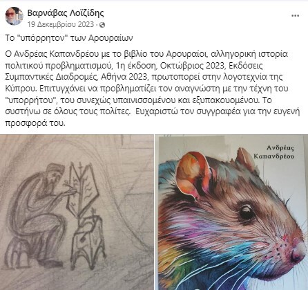 Ο Ανδρέας Καπανδρέου με το βιβλίο του Αρουραίοι, αλληγορική ιστορία πολιτικού προβληματισμού, 1η έκδοση, Οκτώβριος 2023, Εκδόσεις Συμπαντικές Διαδρομές, Αθήνα 2023, πρωτοπορεί στην λογοτεχνία της Κύπρου. Επιτυγχάνει να προβληματίζει τον αναγνώστη με την τέχνη του "υπορρήτου", του συνεχώς υπαινισσομένου και εξυπακουομένου. Το συστήνω σε όλους τους πολίτες. Ευχαριστώ τον συγγραφέα για την ευγενή προσφορά του.