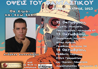 Το βιβλίο θα παρουσιαστεί στα πλαίσια του λογοτεχνικού φεστιβάλ «Όψεις του Φανταστικού 2023 – Κύπρος» που θα διεξαχθεί μεταξύ 12-14 Οκτωβρίου σε Λευκωσία, Λεμεσό και Λάρνακα.