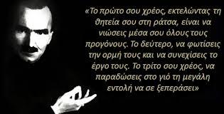 Ας δεχτούμε παλικαρίσια την ανάγκη. Πολεμικός μάςέλαχε ο κλήρος, ας ζώσουμε σφιχτά τη μέση μας. ας αρματώσουμε το κορμί, τηνκαρδιά και το μυαλό μας! Ας πιάσουμε τη θέση μας στη μάχη!