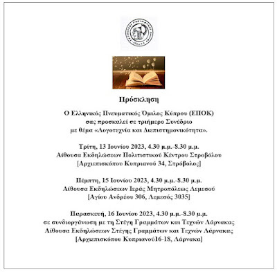 Τρίτη, 13 Ιουνίου 2023 Αίθουσα Εκδηλώσεων Πολιτιστικού Κέντρου Στροβόλου[Αρχιεπισκόπου Κυπριανού 34, Στρόβολος]8.00 μ.μ.- 8.20 μ.μ. Ανδρέας Καπανδρέου, Μέλος Δ.Σ. ΕΠΟΚ, Λειτουργός Πανεπιστημίου – Βιβλιοθηκονόμος (Βιβλιοθήκη Πανεπιστημίου Κύπρου): Βιβλιοθήκες και Βιβλιοθηκονομία στη ΛογοτεχνίαΣυνέδριο ΕΠΟΚ με θέμα «Λογοτεχνία και Διεπιστημονικότητα»