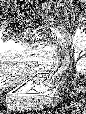 Υπονοείται από τον συγγραφέα ότι ο Κάλος έχει συσχετιστεί με τα πνεύματα του ελαιώνα, ενώ ο ίδιος έχει ζητήσει να ταφεί με τα κλαδιά της ελιάς. Έτσι το δέντρο μεγαλώνει αφύσικα γρήγορα αφού προφανώς τρέφεται από τη δυσαρέσκεια και τη δίψα για εκδίκηση που έχει ο Κάλος, ο οποίος πλέον έχει πάρει τη μορφή του δέντρου.