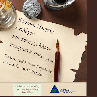 Ο Κύκλος Φιλαναγνωσίας Δημοτικής Βιβλιοθήκης Στροβόλου, τιμώντας την Παγκόσμια Ημέρα Ποίησης διοργανώνει εκδήλωση με θέμα: