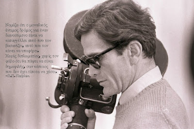 Στον Pier Paolo Pasolini δεν άρεσαν οι εύκολοι δρόμοι. Και δεν ξέπεσε ποτέ σε αυτούς. Άφησε σε άλλους τον εύκολο αντιφασισμό και μας κατέλειπε την διόλου δημοφιλή θεώρησή του. Με σεβασμό στην μνήμη αυτού του χαρισματικού και αδικοθανατισμένου ανθρώπου, παραθέτουμε εκτενή αποσπάσματα από τα σχετικά με το θέμα κείμενά του ευχόμενοι να μην απομακρυνόμαστε πολύ από αυτά. Ο καλόπιστος αναγνώστης θα καταλάβει. Ο κακόπιστος θα συνεχίσει να παίζει “κλέφτες κι αστυνόμους”. Κι αφού δεν θέλει να τα βάλει με τον καπιταλισμό, θα συνεχίσει να τα βάζει με τα κλεφτρόνια της Εξουσίας. Αλλά, ας ξέρει τουλάχιστον, ότι έχει τον ρόλο του χωροφύλακα της Εξουσίας.
