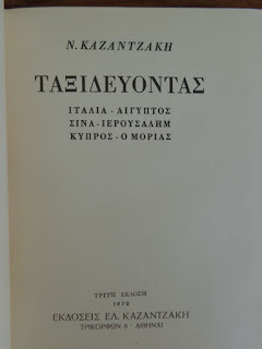 Καζαντζάκης, Νίκος. Ταξιδεύοντας: Ιταλία, Αίγυπτος, Σινά, Ιερουσαλήμ, Κύπρος, ο Μοριάς / Ν. Καζαντζάκη. Αθήνα: [χ.ό.], 1961.