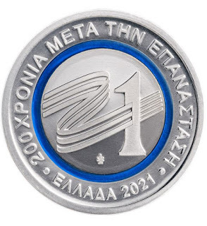 του Νομισματοκοπείου (ΙΕΤΑ). Τέλος, στην περιφέρειά είναι χαραγμένες οι δύο χρονολογίες, 1821 – 2021, οι οποίες συνδέονται με κλαριά δάφνης.