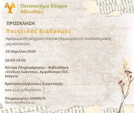 Η Βιβλιοθήκη του Πανεπιστημίου Κύπρου τιμά την Παγκόσμια Ημέρα Ποίησης διοργανώνοντας την εκδήλωση "Ποιητικές Διαδρομές", ένα αφιέρωμα στη σύγχρονη ποιητική δημιουργία της πανεπιστημιακής κοινότητας.