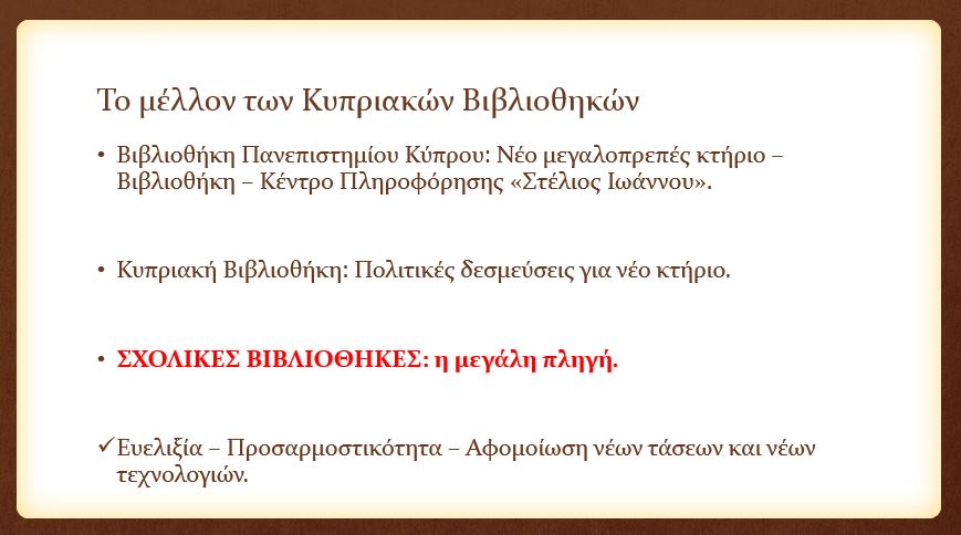 Κυπριακές Βιβλιοθήκες – Σημερινή κατάσταση (παρόν και μέλλον)