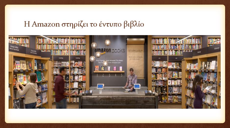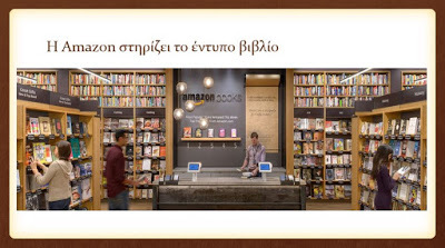 Το παράδειγμα της AmazonΕνδεικτικό παράδειγμα της πιο πάνω τάσης είναι η Amazon, η μεγαλύτερη εταιρεία στον κόσμο σε ότι αφορά την πώληση αγαθών και υπηρεσιών μέσω του Διαδικτύου. Η Amazon ήταν η εταιρεία που λάνσαρε στην αγορά τον ηλεκτρονικό αναγνώστη Kindle προωθώντας φανατικά το ηλεκτρονικό βιβλίο. Μετά από μια δεκαετία πολεμικής της Amazon ενάντια στους παραδοσιακούς εκδότες και βιβλιοπώλες, αποφάσισε να αλλάξει τακτική στηρίζοντας πλέον το έντυπο βιβλίο, ανοίγοντας μάλιστα και δικά της συμβατικά βιβλιοπωλεία