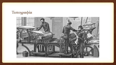 Τυπογραφία Η τεχνολογία τον 15ο αιώνα έφερε μια επαναστατική εφεύρεση για την παραγωγή και τη διάδοση του βιβλίου, την τυπογραφία. Με την διάδοση της τυπογραφίας τα βιβλία εκτυπώνονταν (δεν αντιγράφονταν πλέον με το χέρι) και παράγονταν ευκολότερα σε πολλαπλά αντίτυπα. Τα αντίτυπα ήταν πολύ φτηνότερα και προσιτά σε όλο τον κόσμο. Αυτό είχε ως αποτέλεσμα τη μαζική διάδοση όχι μόνο του ίδιου του βιβλίου αλλά και της γνώσης που αυτό περιείχε. Το βιβλίο μεταφέρθηκε σε βιβλιοπωλεία και σε δημόσιες βιβλιοθήκες όπου ο καθένας πλέον μπορούσε να το διαβάσει, σε κάποιες περιπτώσεις ακόμη και δωρεάν. Συνεπώς, η τυπογραφία βοήθησε εμμέσως και στη διάδοση της γραφής και της ανάγνωσης και συνέβαλε στην σταδιακή καταπολέμηση του αναλφαβητισμού. Στην περίπτωση της τυπογραφίας, λοιπόν, έχουμε μια χαρακτηριστική περίπτωση όπου η τεχνολογία λειτούργησε άκρως ευεργετικά στην ανθρωπότητα: έδωσε την ευκαιρία σε πολλούς να διαβάσουν τα τυπωμένα βιβλία, αλλά και να γράψουν και να τυπώσουν τα δικά τους, διαδίδοντας έτσι τις ιδέες και τις γνώσεις σε όλο τον κόσμο.