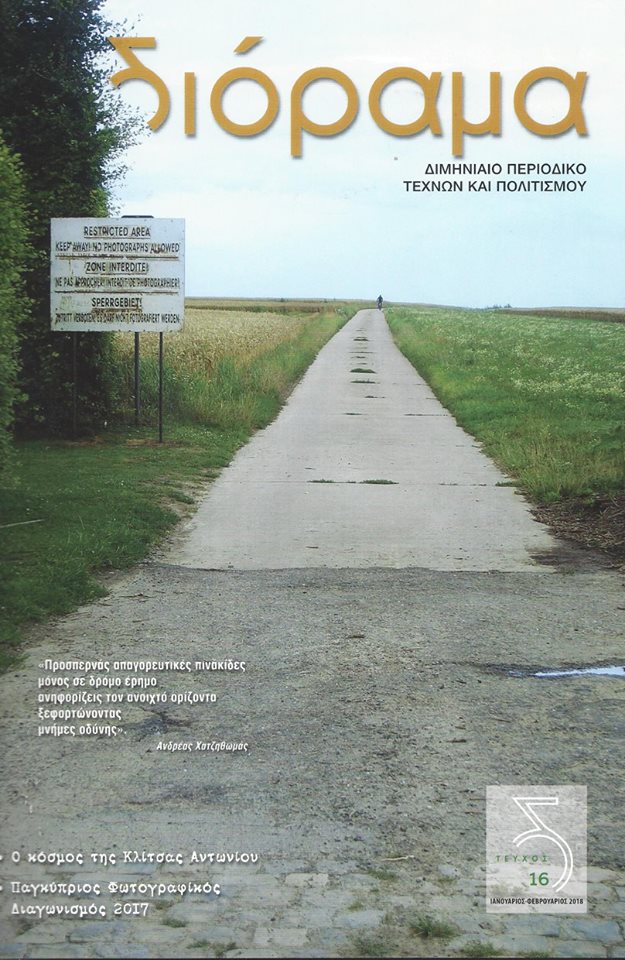 Κυκλοφόρησε το νέο τεύχος (#16) του διμηνιάιου περιοδικού τεχνών και πολιτισμού «Διόραμα».*Εξώφυλλο: Κλίτσα Αντωνίου «Απαγορεύεται η λήψη φωτογραφιών πέρα από το σημείο αυτό», 2009. Περιεχόμενα: ΘΕΣΕΙΣ – ΑΠΟΨΕΙΣ – ΣΧΟΛΙΑ