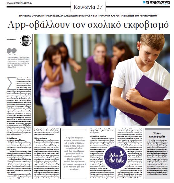 Σημαντική και άκρως ανησυχητική αύξηση παρουσιάζουν τα τελευταία χρόνια τα κρούσματα σχολικού εκφοβισμού και βίας στην Κύπρο. Η βία στο σχολείο έχει διάφορες μορφές. Άλλοτε είναι σωματική, άλλοτε λεκτική κι άλλοτε ψυχολογική, ενώ σε κάποιες περιπτώσεις είναι και σεξουαλική. Τέτοιες μορφές βίας μπορούν, μάλιστα, να είναι συνδυαστικές. Ανεξαρτήτως, όμως, της μορφής τους, όλες έχουν σοβαρό συναισθηματικό αντίκτυπο, ενώ μπορεί να τραυματίσουν για πάντα την ψυχή των θυμάτων και να στιγματίσουν τη ζωή των θυτών. Έχοντας αυτά κατά νουν και θέλοντας να συμβάλει στην προσπάθεια πρόληψης και αντιμετώπισης του σχολικού εκφοβισμού, γνωστότερου ως bullying, η Ομάδα «Join the Tale» («Μπείτε στο παραμύθι») προσεγγίζει μέσα από κινητά και ταμπλέτες τα παιδιά προσφέροντας εκπαιδευτικές ιστορίες, τις οποίες μπορούν να διαβάσουν, να ακούσουν, ακόμη και να συμμετέχουν σε αυτές. Η βιβλιοθήκη διαδραστικών ιστοριών της «Join The Tale» αποτελείται από ιστορίες στα ελληνικά και αγγλικά με επιλεγμένη θεματολογία από την καθημερινότητα, επεξεργασμένες από ειδικό παιδοψυχολόγο.Η Ομάδα και σε ποιους απευθύνεταιΗ Ομάδα αποτελείται από Κύπριους επαγγελματίες -πετυχημένους στον τομέα τους-, οι οποίοι είναι αφοσιωμένοι στην προσπάθεια για επιτυχία του έργου. Πρόκειται για τους:* Βασιλική Παπαχαραλάμπους, Εγκεκριμένη λογίστρια, η οποία συνέλαβε την αρχική ιδέα και συμμετείχε στη δημιουργία του επαγγελματικού σχεδίου.* Ανδρέα Καπανδρέου, Βιβλιοθηκονόμο - Συγγραφέας, ο οποίος συμμετέχει στη συγγραφή και το στήσιμο των ιστοριών.* Μαρία Περδικογιάννη, Παιδοψυχολόγο, η οποία είναι υπεύθυνη για την ψυχολογική - διδακτική προσέγγιση των ιστοριών και τη δημιουργία των ψυχολογικών προφίλ.Σημειώνεται πως η εφαρμογή απευθύνεται σε παιδιά 4-10 χρονών, καθώς και στους γονείς τους. Αξίζει δε να τονιστεί πως διατίθενται δωρεάν μέσω iTunes kai Google Play Store για κινητά τηλέφωνα και ταμπλέτες, σε ελληνική και αγγλική γλώσσα.