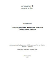 Andreou, Andreas K. Providing electronic information sources to undergraduate students., 2001 Dissertation Thesis thesis, University of Wales, Aberystwyth (UK). [Thesis]The electronic information sources have become an integral part of the library services and they have a crucial role to play in the higher education. Undergraduate students depend their studies on electronic sources. However, electronic information sources cannot be used effectively without the necessary training by the library. The right instruction should be given to students on how each electronic source should be used. The evaluation of the information electronic sources though a survey on the students´ opinion is of equal importance. The survey can help the library to find the real educational needs of the students as regards the electronic sources, to discover any possible weaknesses in the whole process and to improve its electronic services.