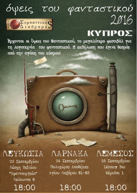Δεξιά η αφίσα των εκδηλώσεων Όψεις του Φανταστικού 2016 που θα πραγματοποιηθούν στην Κύπρο (Λευκωσία 23/9, Λάρνακα 24/9 και Λεμεσό 25/9).