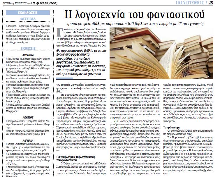 Δημοσίευμα του Φιλελεύθερου για τις Όψεις του Φανταστικού 2016 στην Κύπρο