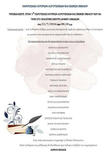 Πρόσκληση για την πρώτη παρουσίαση Κυπρίων λογοτεχνών και έκθεση βιβλίου που γίνεται σε συνεργασία και στα πλαίσια του πολιστικού μήνα δήμου Λιβαδιών (Λάρνακα). Παρασκευή, 22 Ιουλίου 2016 στις 8:30 μ.μ. - 10:30 μ.μ., στο πολιτιστικό κέντρο Δήμου Λιβαδιών (Λαρνακα).