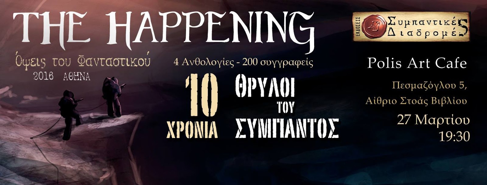 Δέκα χρόνια μετά την έκδοση της πρώτης ανθολογίας οι Συμπαντικές Διαδρομές γιορτάζουν και τιμούν τους συγγραφείς που συμμετείχαν στις ανθολογίες διοργανώνοντας την εκδήλωση THE HAPPENING. Η εκδήλωση θα πραγματοποιηθεί στην Αθήνα, στα πλαίσια των εκδηλώσεων Όψεις του Φανταστικού, την Κυριακή 27 Μαρτίου από τις 7.30 το βράδυ στο Polis Art Cafe, Πεσμαζόγλου 5, Αίθριο Στοάς Βιβλίου.