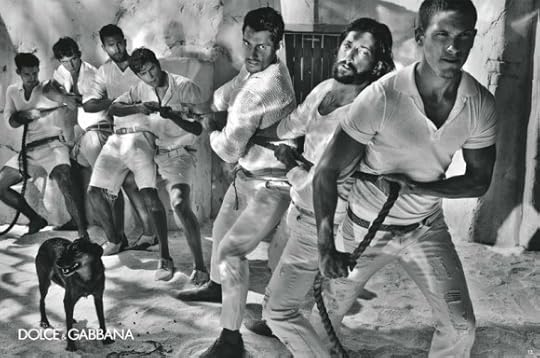 But what really made my day was this Dolce & Gabbana spread (top). As I've said, I'm tragically out of the loop when it comes to fashion, but I didn't see anything in this ad that resembled fashion. It's a black-and-white spread featuring seven guys involved in a very intense game of tug-of-war. We do not see against whom they are tugging. Maybe the guys in the Calvin Klein ad. They look like inmates from a Turkish prison, and all have varying degrees of facial hair and lengths of fabric torn off their white pants. The one in the front looks vaguely like Barack Obama scolding John Boehner. They dig their feet-all wearing oxfords, some without laces-into the sand. At the bottom left of the spread, looking off the page, is a small black dog that looks seriously underfed. I do not understand the significance of the dog, and this disturbs me. Meanwhile, I draft in my head a novelization of the ad, a cross between The Great Gatsby, The Dirty Dozen, and Midnight Express.