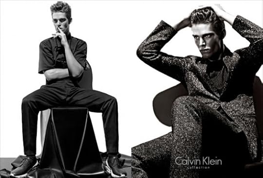 I thought women's magazines were bad! Holy crow. I couldn't get past the advertising. These two guys in the Calvin Klein spread (above) look like a cross between Frankenstein's monster and the guy on the cover of Atlas Shrugged. The guy on the right's intent stare could melt glass, and there is so much product in vertical sculpture of his hair that he better not get too close to an open flame, lest he reenact Michael Jackson's Pepsi ad. The dude on the left looks like he's having a very intense discussion with himself about whether he left the iron on.