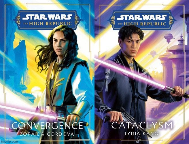 My novel is the first one in Phase II, 350 years before the events we know in the Star Wars we grew up with. Convergence is a book about two planets at war, love, hope, betrayal, and finding your place in the greater galaxy. There’s a B&N special edition hardcover, a regular hardcover, a Goldsboro special edition with sprayed edges. And the companion novel wraps things up with Lydia Kang’s Cataclysm.