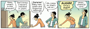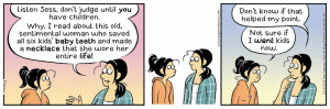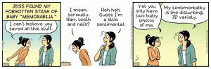 Man, I had a lot of fun writing last week’s strips. This was a short series in which Jess discovers an old stash of Jill’s “memorabilia” from the kids’ early years.