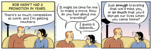 So, it’s time to shake things up again. The average worker today spends about 5 years at a job before changing. That’s a good reason for Rob to make a move (Jill doesn’t count, as she freelances — thereby changing jobs all the time).