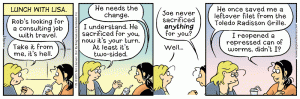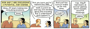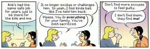Not long ago, a reader asked me if I would do a story line about Rob’s job. Specifically, if I would shake things up a little. Years ago, I had done just that — made the poor guy lose his job. Luckily, he got a new one, and all was well. For a while. For a long, LONG while, apparently.