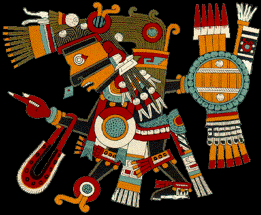In this drawing by Karl Taube taken from a ceramic vase, the figure of Heart of Sky is shown with the obsidian mirror in his forehead and the swirls of smoke and flame coming out of it.