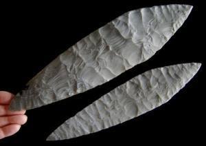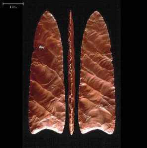 In studying the sites along the east coast, Stanford found artifacts very similar to those made by the Solutrean Age people of northern Spain/southern France, especially the fluted bi-facial points. (See photo.) According to Stanford, working both sides (faces) of a spear point or knife is relatively uncommon. Most ancient people worked only one side of the stone. Flutes are the hollowed-out sections in the points that allowed them to be hafted (attached) to a spear or dart.