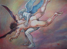 The top picture is a pastel drawing, based on one of the photos that Muybridge published in his monumental work "The Human Figure in Motion". I turned it into a mythical battle between an Angel and a Demon. Underneath a watercolor-gouache painting titled" Cataklisme of Dendera"Both works date from around 1999.