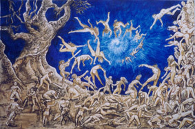 L'image du haut est un dessin au pastel, basé sur l'une des photos que Muybridge a publié dans son ouvrage monumental "The Human Figure in Motion”. J'ai créé une bataille mythique entre un Ange et un demon. Sous une peinture gouache-aquarelle, intitulée “Cataclisme de Dendera”. Les deux œuvres datent de 1999 environ.