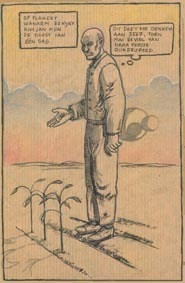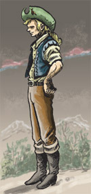 Twee stijloefeningen alweer, of laten we zeggen tekeningetjes gemaakt op een 'dood' moment. Links een Chinees uitziend man in een futuristisch decor, die zich vreemde zaken herinnert... Potlood en stift op inpakpapier.Onder een jongeman in een soort 16-eeuwse outfit, die voor zich uitstaart en dagdroomt. Tekening op Schoeler-Hammer, inkleuring met Photoshop.