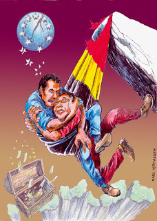 Tussen 17 juni 2010 en 6 december 2011 had België geen regering. In de slopende laatste weken van de regeringsvorming lag de Open VLD (liberalen) van Alexander De Croo nog dwars. Op de tekening zie je Di Rupo en De Croo die elkaar in een wurggreep houden en in de afgrond dreigen te storten. De Europese sterren op het hemellichaam op de achtergrond beginnen af te brokkelen.