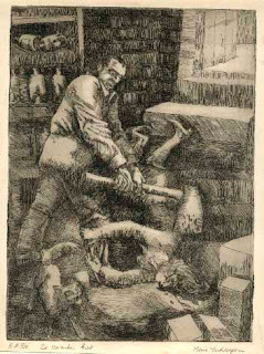 An etching from my student days (about 1976). It is an illustration for the short story "The Black Cat" by Edgar Allan Poe (1809-1849). He had a taste for scary stories and his work may be considered as the precursor of the gothic novel.