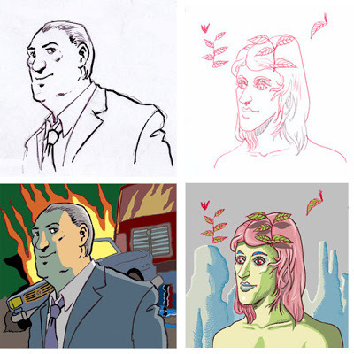 Onderaan zie je een voorbeeld van twee krabbels, die ik uiteindelijk heb ingescand en digitaal ingekleurd. De illustraties hadden geen enkele bedoeling en zijn zonder erbij na te denken op papier gezet tijdens een telefoongesprek. Toch kan je er nog iets van maken, als je er even tijd in steekt.