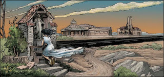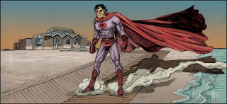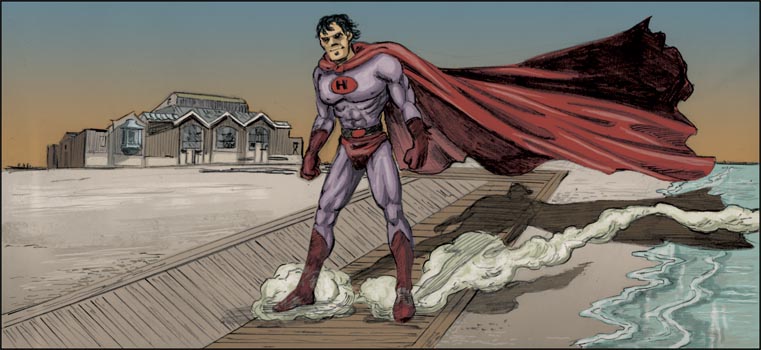 Het was niet makkelijk om bij dit vers een gepaste tekening te verzinnen. De redder waarvan sprake kon het best uitgebeeld worden door middel van een man die Mary uit het moeras van de eentonigheid en middelmatigheid zou trekken. Maar wat voor man? Een kantoorbediende? Een makelaar? Een politicus? Een geslaagde zakenman? Uiteindelijk heb ik gekozen voor een niet bestaande superheld, met een "H" op zijn borst. De "H" van Hero. De plankenvloer onder zijn voeten zag ik op één van de foto's die ik vond van Bruce in zijn begindagen. Het is dezelfde soort plankenvloer die je ziet in de generiek van "Boardwalk Empire" als Steve Buscemi van het strand naar de stad loopt. Atlantic city dacht ik.
